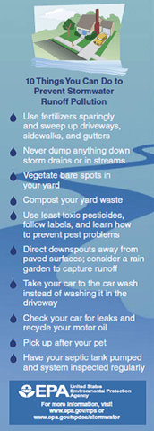 The implementation of environmentally friendly household habits not only improve water quality, but provide cleaner and more aesthetically pleasing local water bodies and streams, enhanced recreation opportunities and healthier environment for residents and wildlife. For more information on best stormwater practices, click here on steps to protect our waterways!